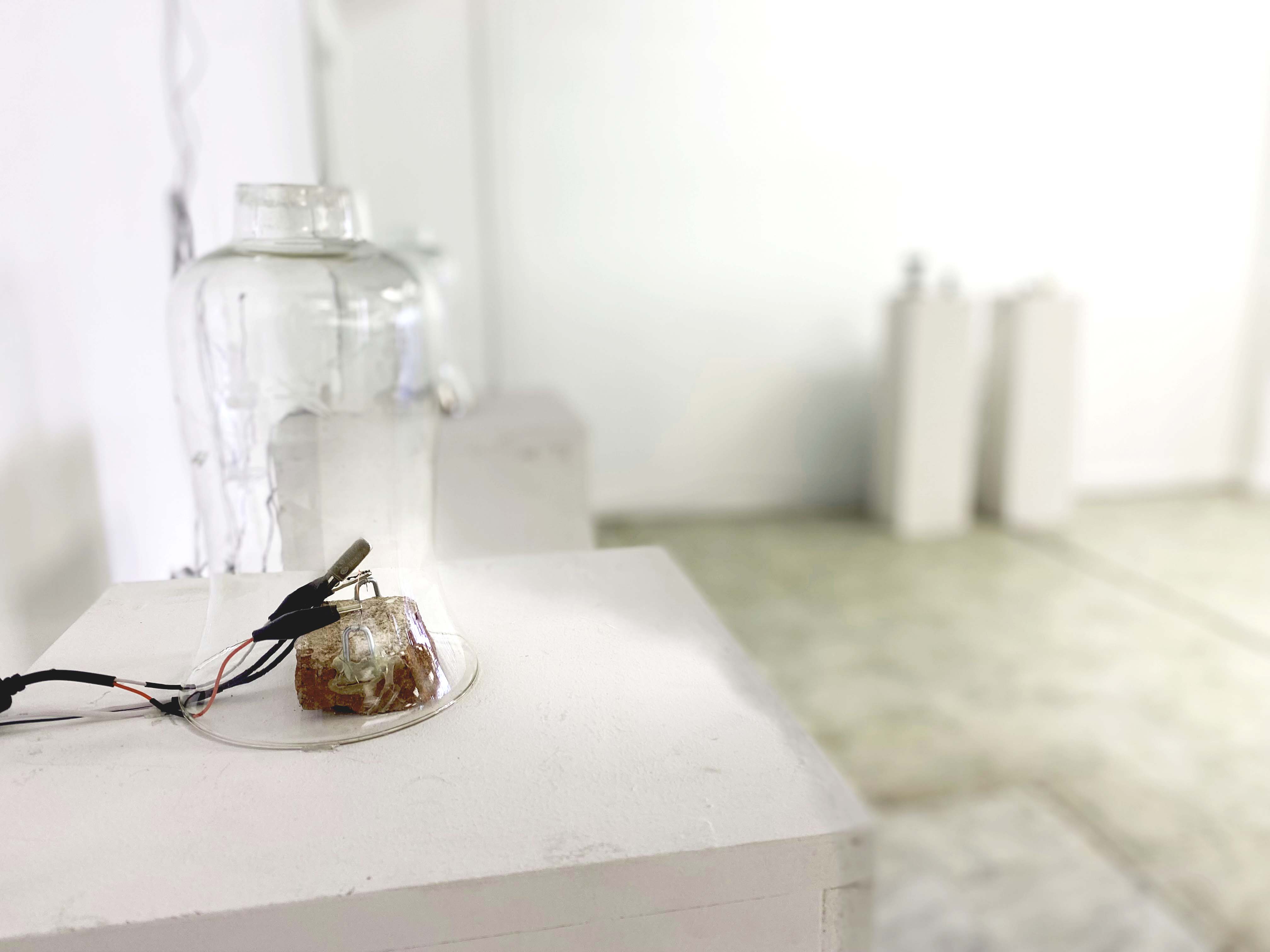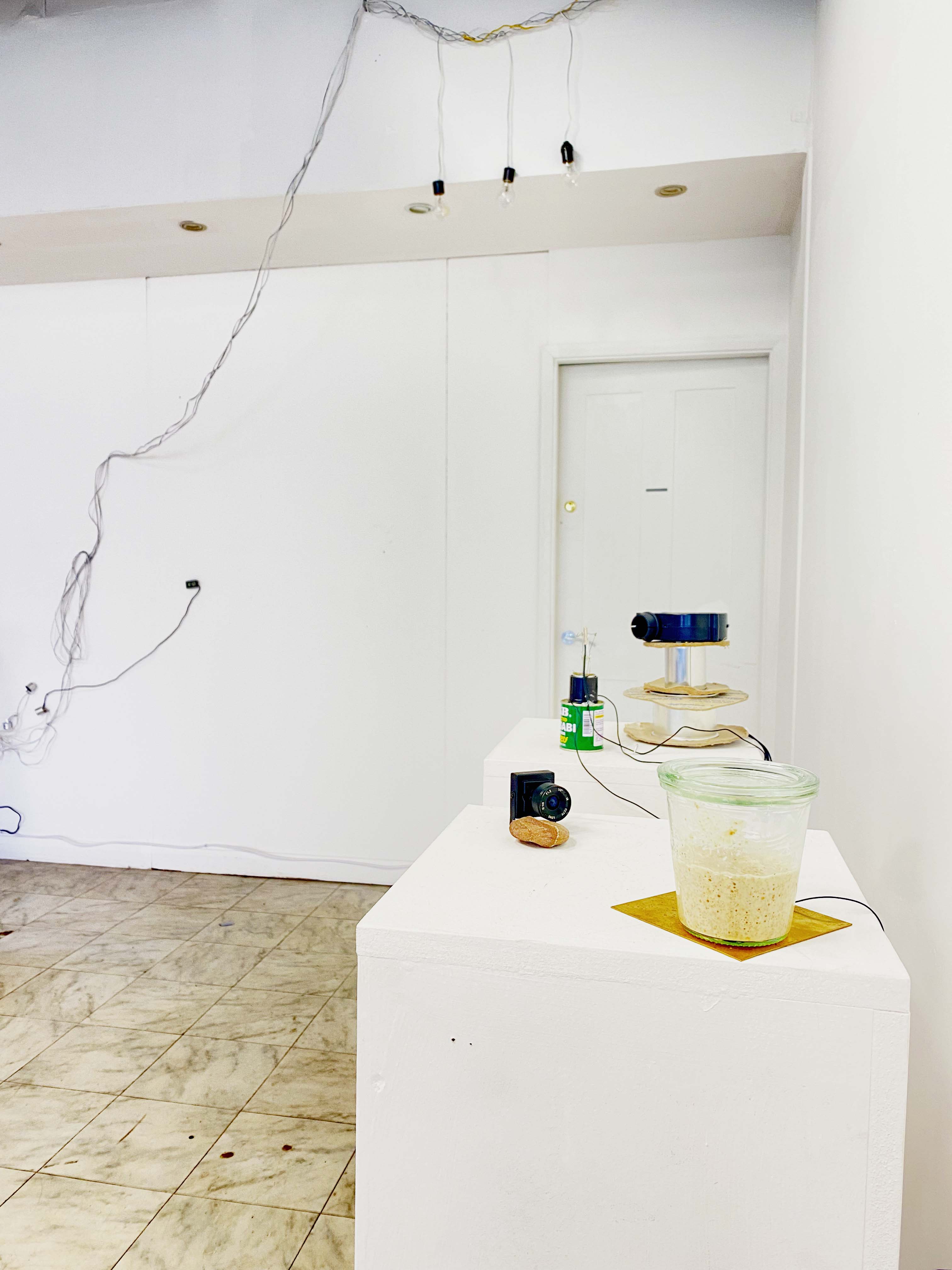 This new work examines an overlapping and interacting temperature ecosystem. Component are constructed into new contraptions, which operate in their own right but also are tightly interconnected. In the midst of islands of (un)predictable thermal systems, there is my sourdough starter, fed twice a day with water (10g) and 12g flour (12g). This maintenance of these bacteria, fermentation, is a simplest yet most profound knowledge of human kind. One of the keys to have a wild yeast alive is, once more – temperature. The overall shows a complexity of eco-culture.